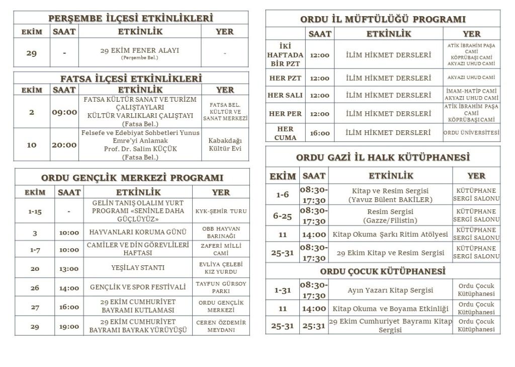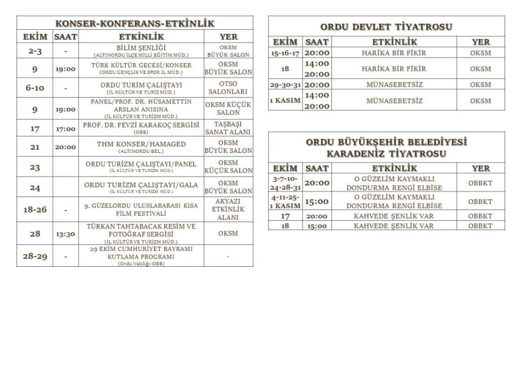 Ordu Kültürel Etkinlik Takvimi Ekim 2025